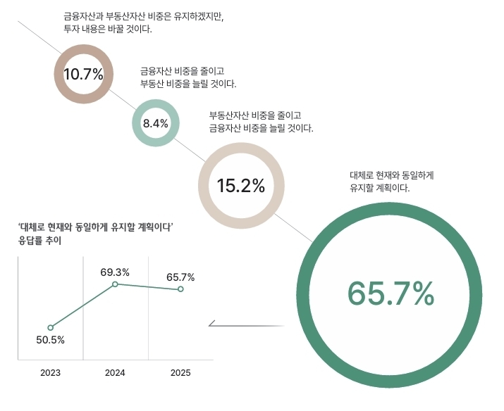 올해 부자의 부동산 매수의향은 44%로 전년(50%) 대비 하락했고, 매도 의향은 34%로 전년(31%) 대비 소폭 상승했습니다. 연구소는 이를 시장 불안이 해소될 때까지 다음 기회를 탐색하거나, 부동산보다 금융을 활용해 자산을 운용하려는 의향이 높았던 만큼 금융 투자를 다양화하려는 전략으로 해석했습니다.